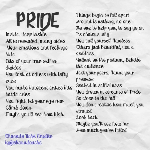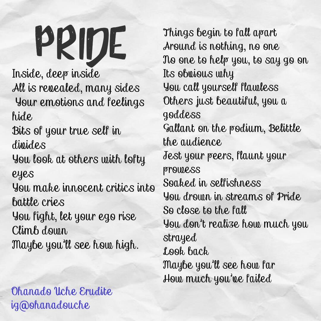 Pride October 13, 2017October 13, 2017 Rate this:Share this: Click to share on WhatsApp (Opens in new window) WhatsApp Click to share on Facebook (Opens in new window) Facebook Click to email a link to a friend (Opens in new window) Email Click to share on LinkedIn (Opens in new window) LinkedIn Click to share on X (Opens in new window) X Like Loading... Related Published by symolean I don't write... I write! View all posts by symolean