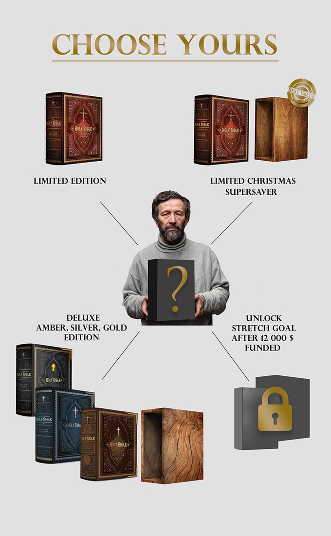 Creators of this project promosed produce 5 versions of The World’s Most Beautiful Bible + 1 “stretch goal” version after they’ll reach $12 000 funding.